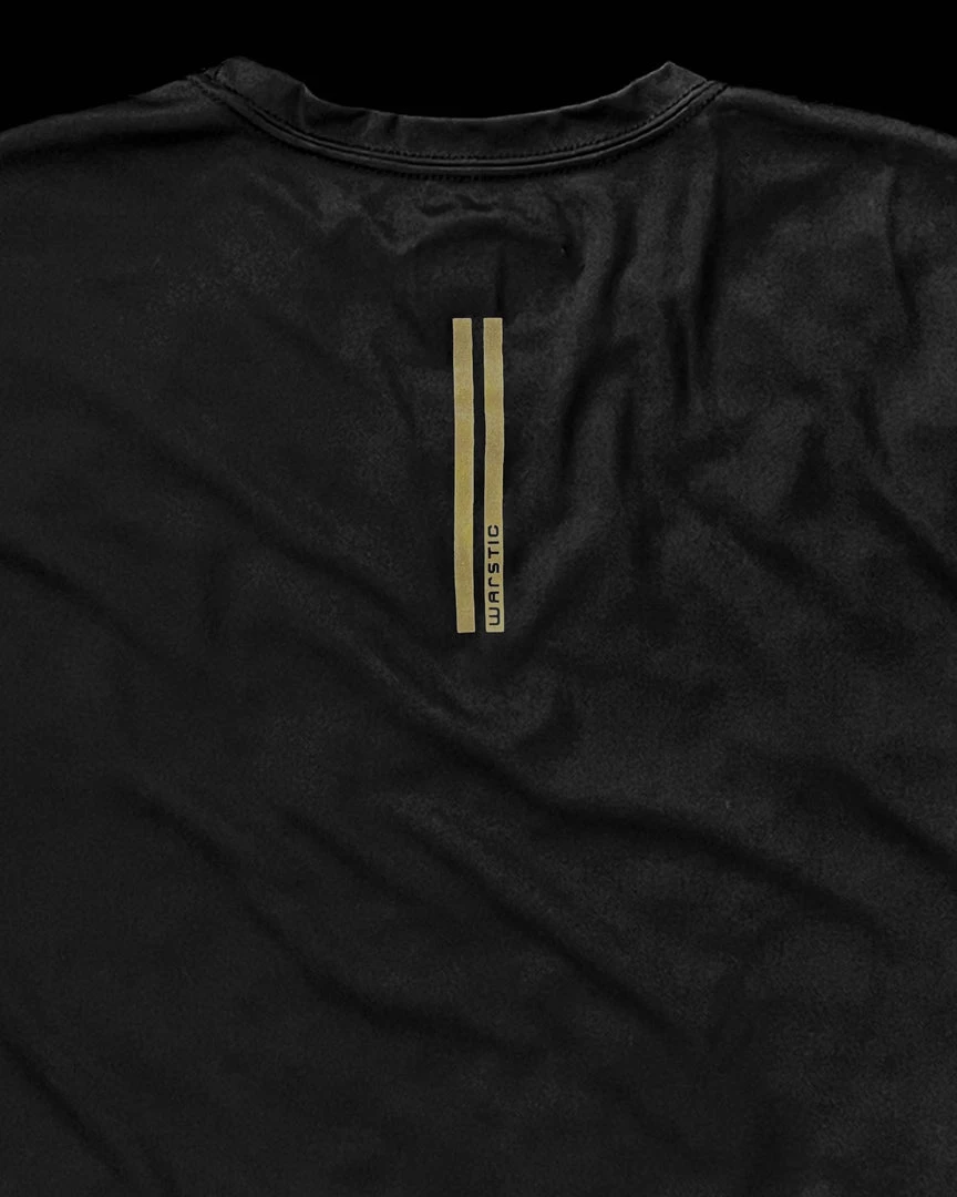 The Official Team Warstic Dri Performance Shirt is part of the standard issue practice gear worn by our Teams. With it’s moisture wicking material, the Dri Performance Shirt is great for a hot afternoon training session, or a cooling undershirt. Features “Warstic” screened across the chest in our signature gold, with gold Warstripes on the back between the shoulders.