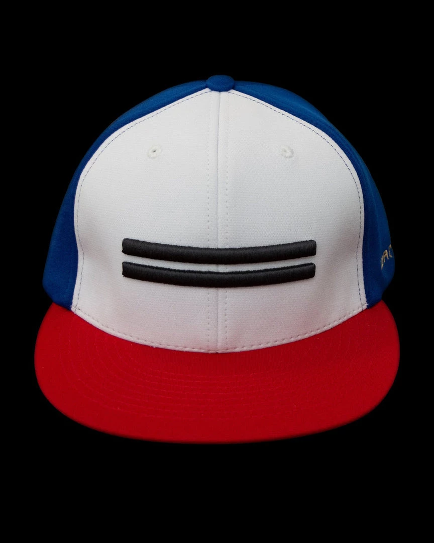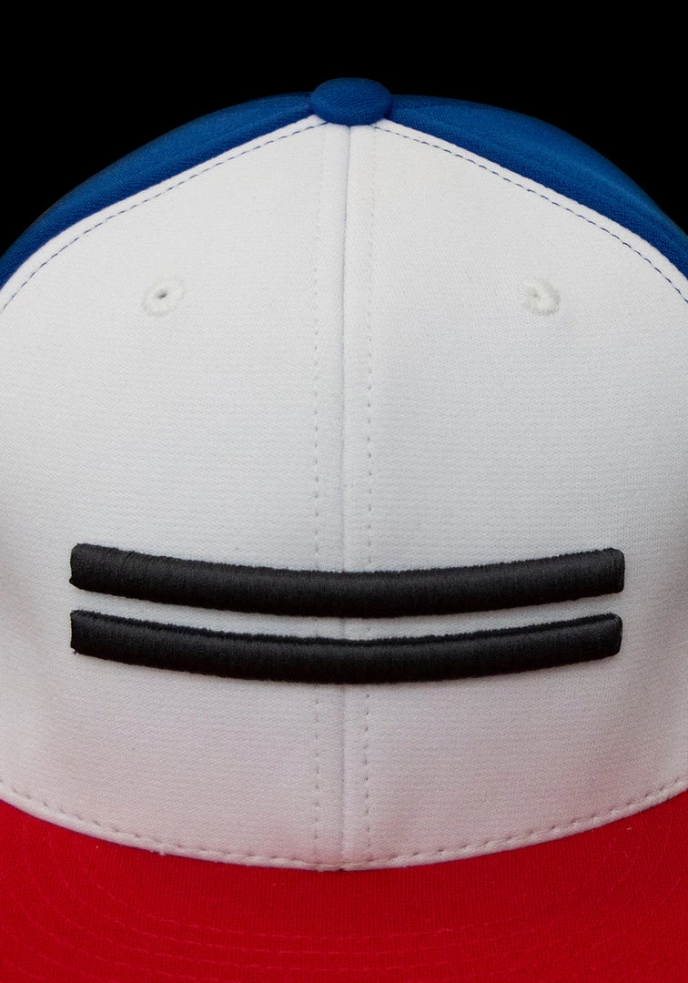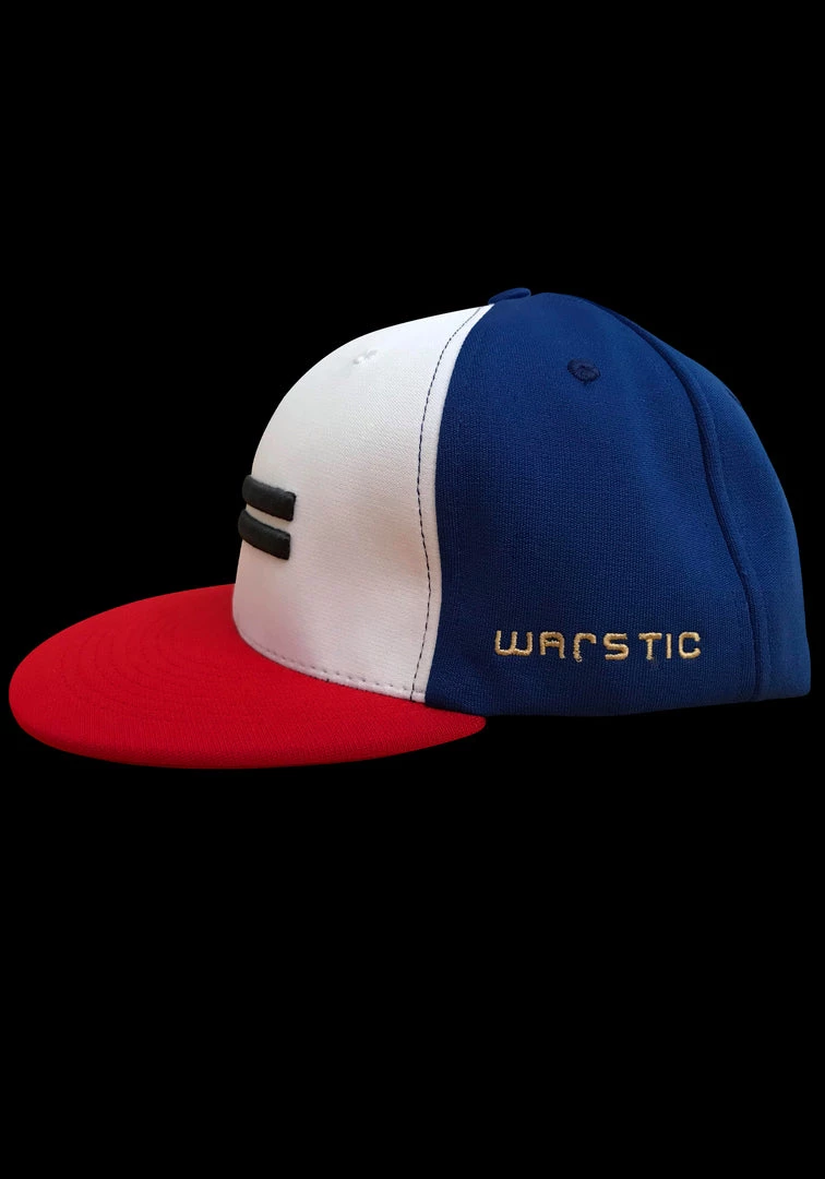 Official Team Warstic National Game Cap features red brim, white front with black embroidered Warstripes and blue rest of cap. Stretch fit, six-panel design; polyester/spandex blend. Available in four sizes.