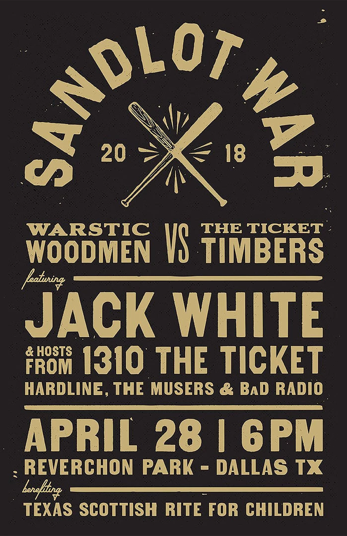 This special edition screen print commemorates the 2018 Sandlot War game of The Warstic Woodmen vs 1310 The Ticket Timbers on April 28, 2018. Poster is 13″x19″ and features a black background with metallic gold ink.