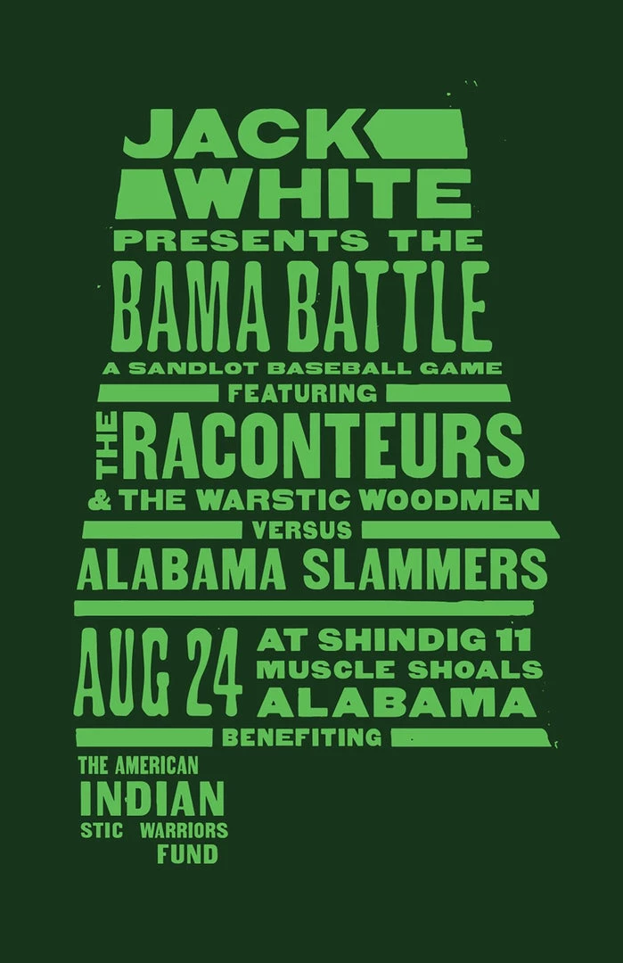 This special edition screen print commemorates the 2019 Sandlot game of The Warstic Woodmen vs Alabama Slammers at the Billy Reid Shindig 11 in Florence, Alabama. Poster is 13″x19″ and features a dark green background with a bright green print.Â
