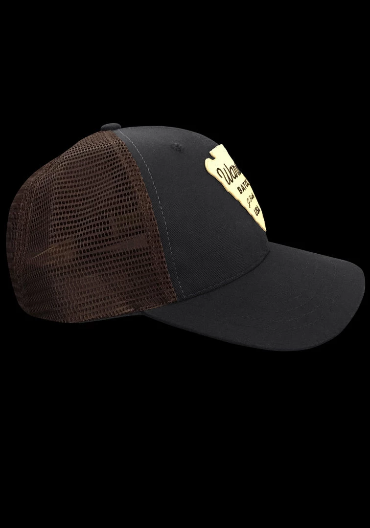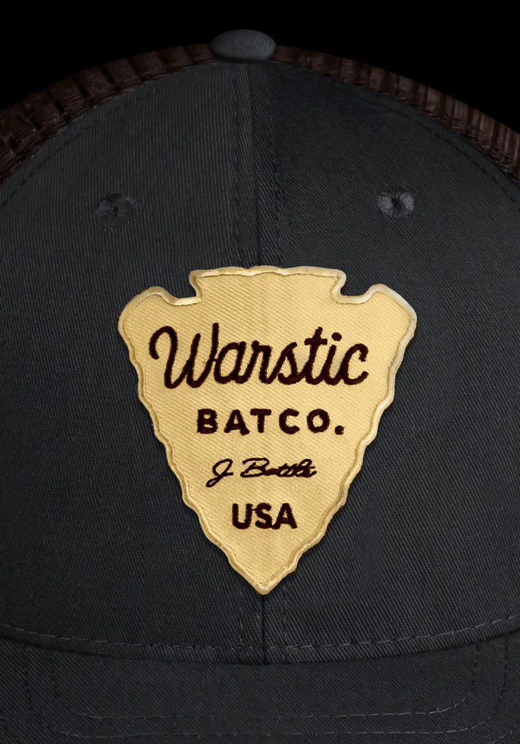 The Warstic Off-Season Snapback Black/Tobacco (Arrowhead) features a gold arrowhead patch. Six panel design; mesh back with polyester front. Snapback. One size fits most.