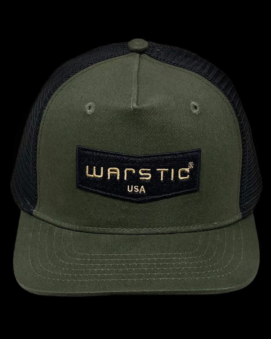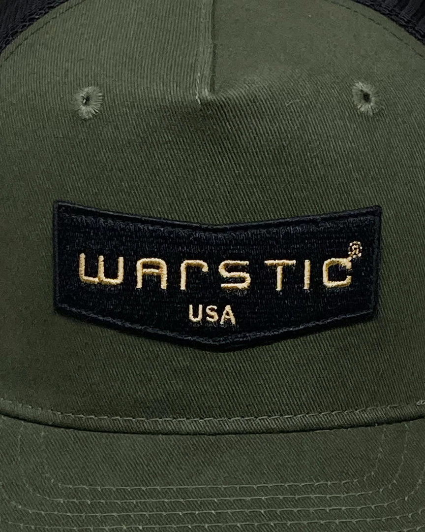 The Warstic Trucker Snapback Army Green/Black (Chevron) features our Chevron logo as a black patch with “Warstic” written in gold. Five panel design; mesh back with polyester front. Snapback. One size fits most.