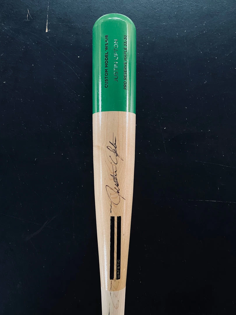 Bats created for Justin Upton for the Warstic Short Film “The Art of Hitting”. Pro Reserve Maple 33/30 WSJU8. Natural Bat with glossed handle and green Wartip. Features black Warstic logo and white engraving. Autographed.