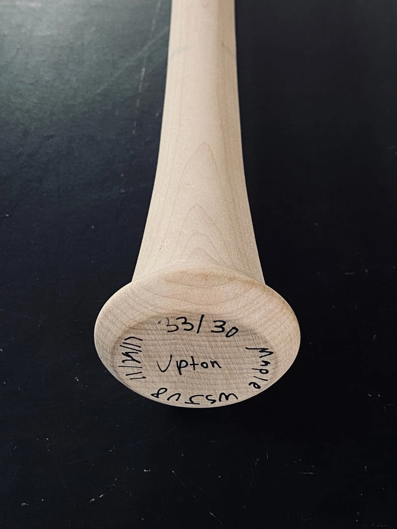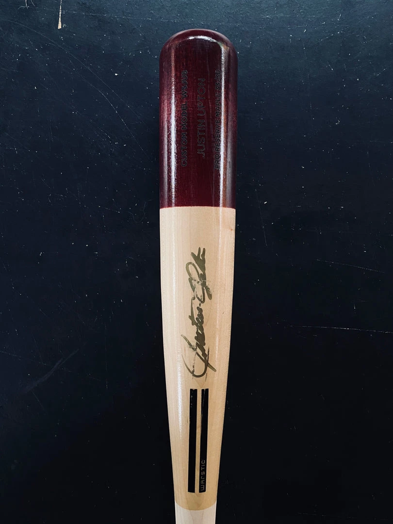 Bats created for Justin Upton for the Warstic Short Film “The Art of Hitting”. Pro Reserve Maple 33/30 WSJU8. Natural Bat with glossed handle and maroon Wartip. Features black Warstic logo and white engraving. Autographed.