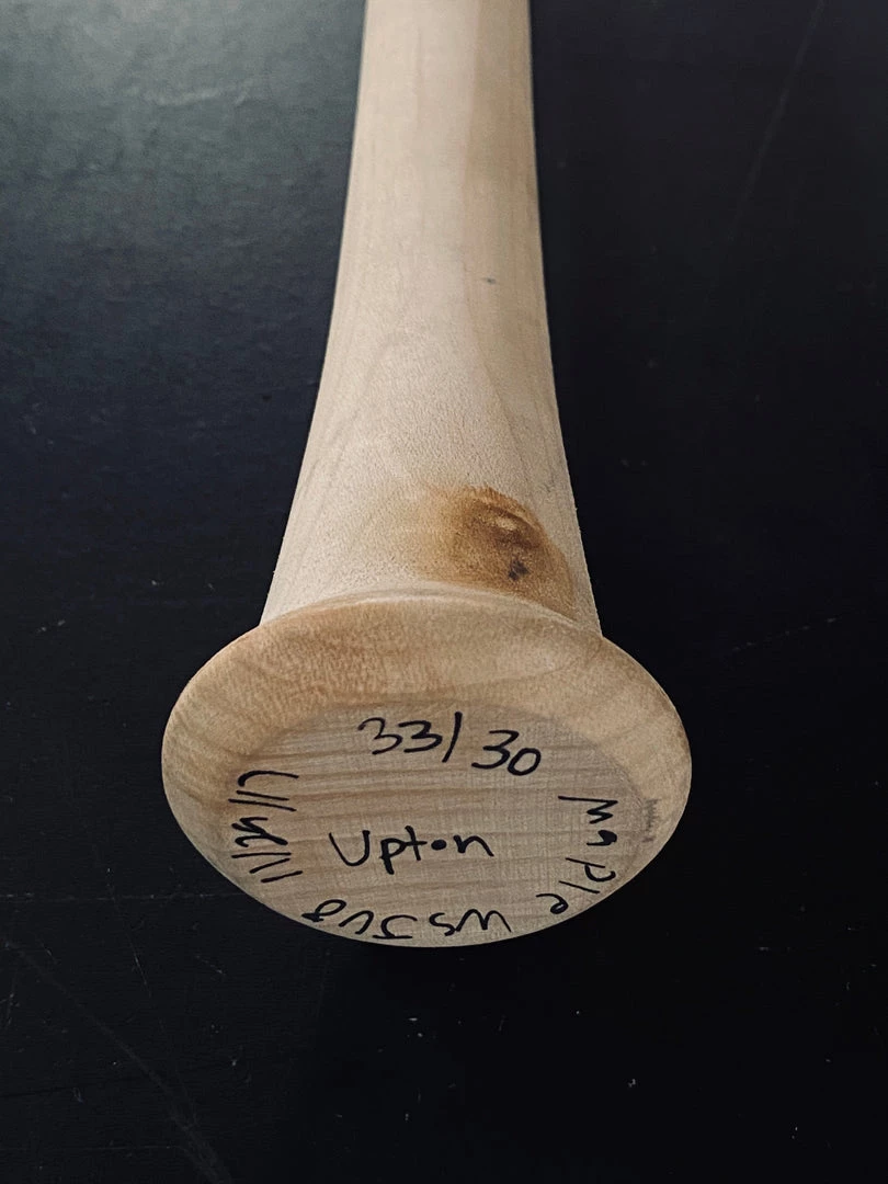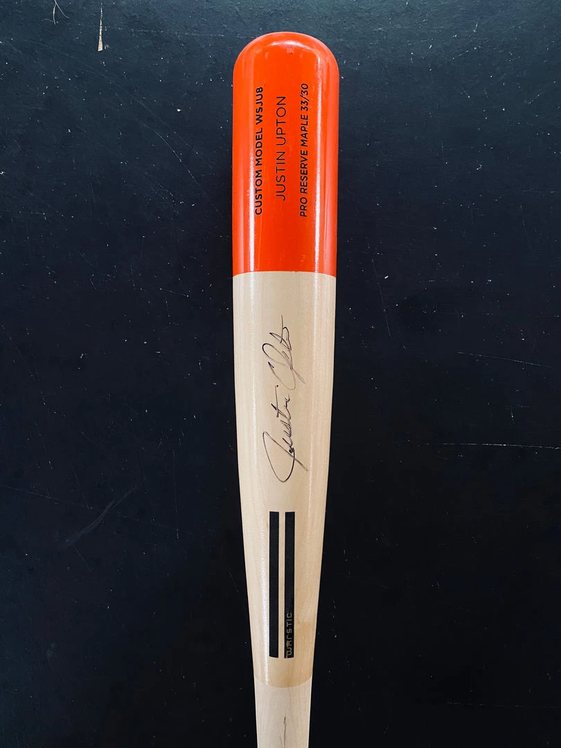 Bats created for Justin Upton for the Warstic Short Film “The Art of Hitting”. Pro Reserve Maple 33/30 WSJU8. Natural Bat with glossed handle and orange Wartip. Features black Warstic logo and white engraving. Autographed.