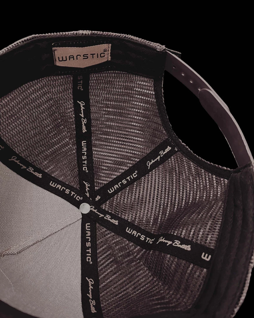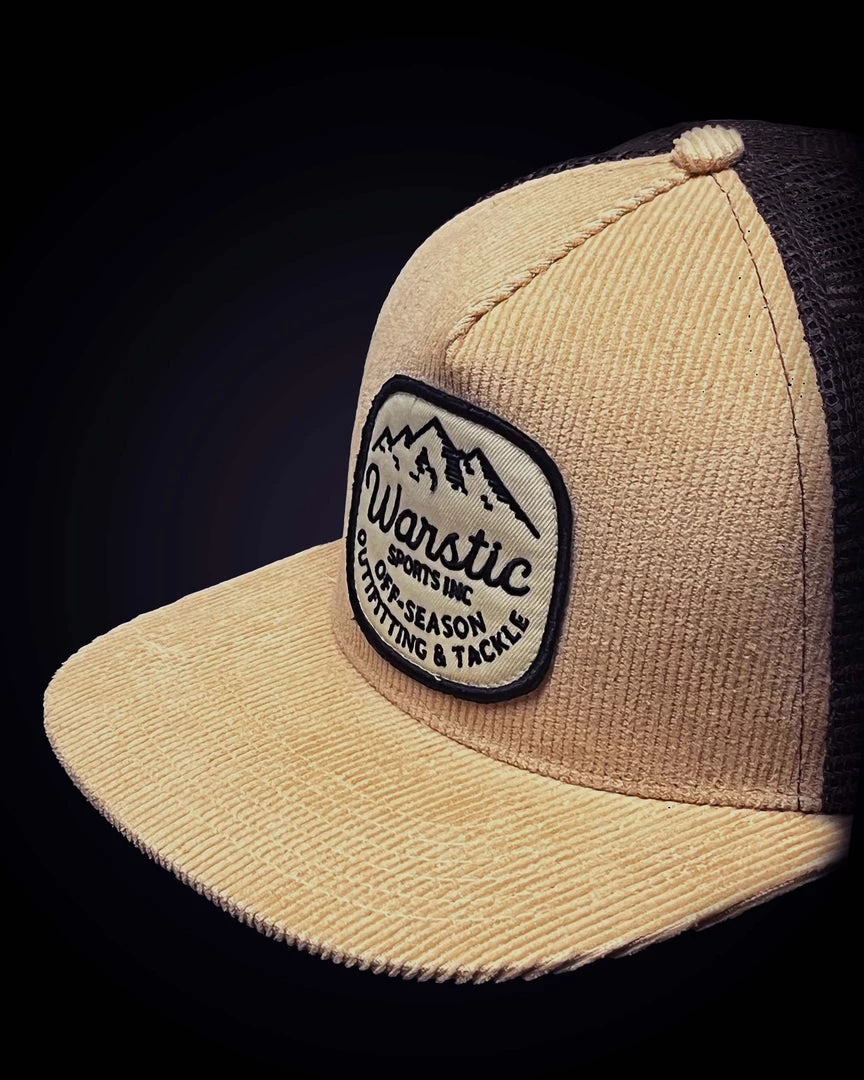 The Corduroy Trucker Snapback Khaki/Tobacco (Tackle) features a patch inspired by outfitter logos, with Warstic in script under mountains with “Off-Season Outfitting & Tackle” underneath, embroidered in black thread on a white patch, sewn onto the khaki colored corduroy. Five panel design; mesh back with corduroy front. Snapback. One size fits most.