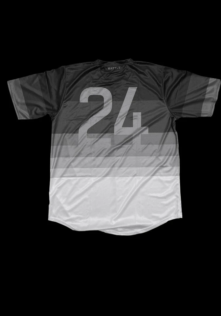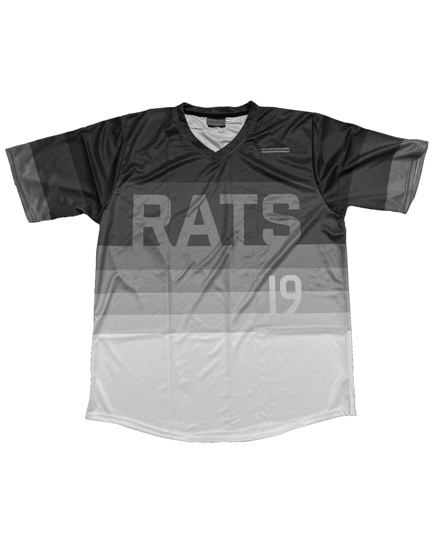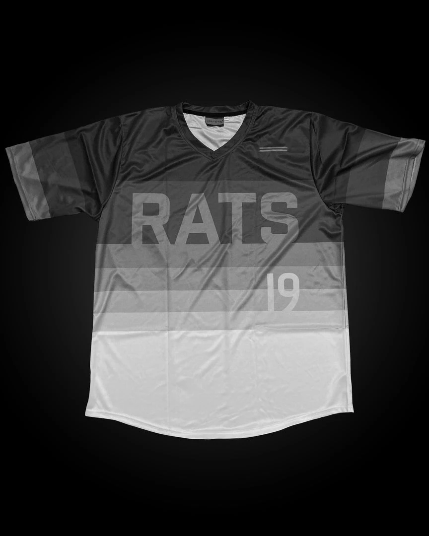The Dallas Rats Jersey is made of a lightweight wicking material, with a gradient color pattern that starts as dark gray at the shoulders and transitions to white at the bottom of the jersey.