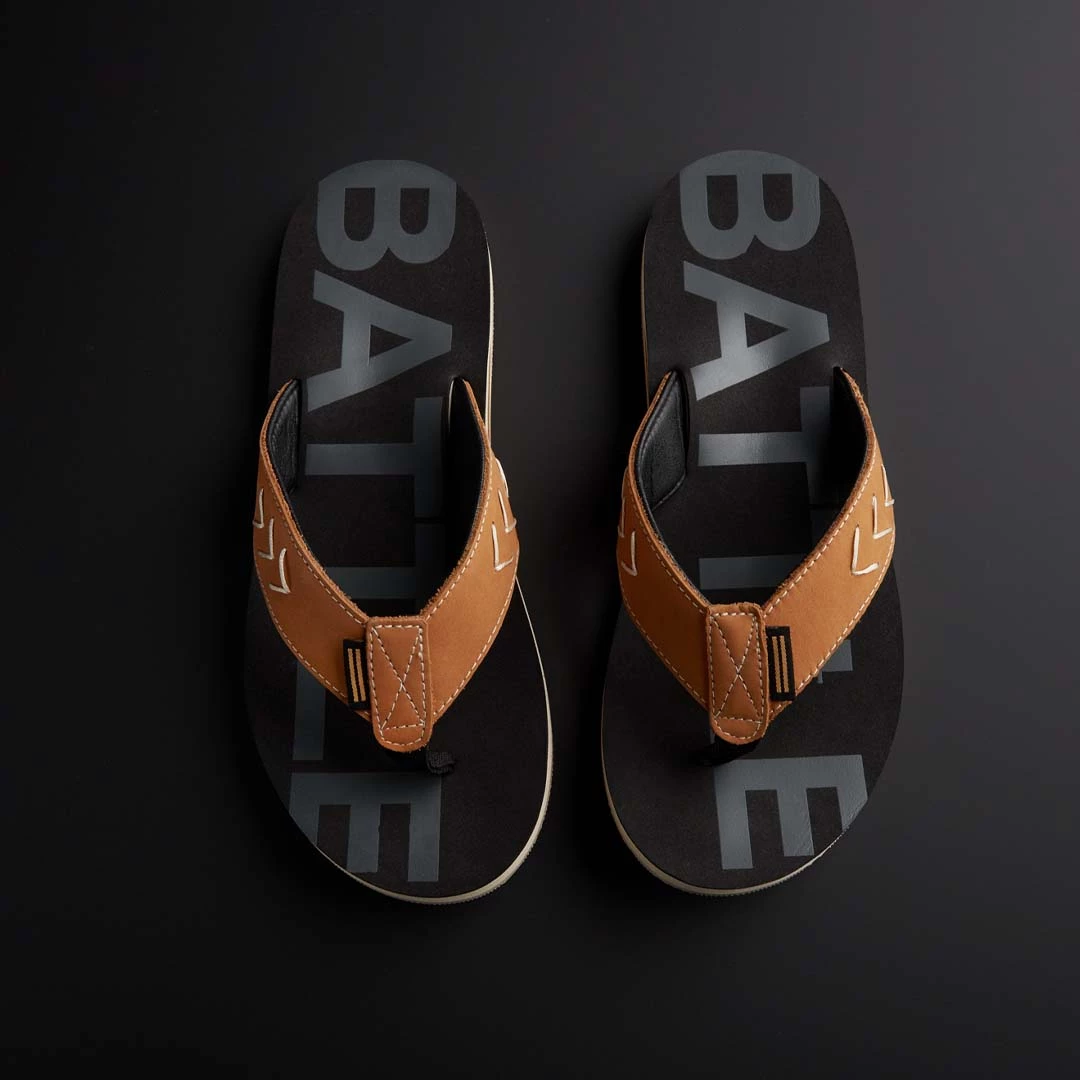 Stay battle ready this summer with the all new Warstic Battle Flip Flops. Featuring genuine leather straps with off white hand stitching, and “BATTLE” printed on the ultra soft footbed, these flip flops will keep you comfortable on even the hottest days.