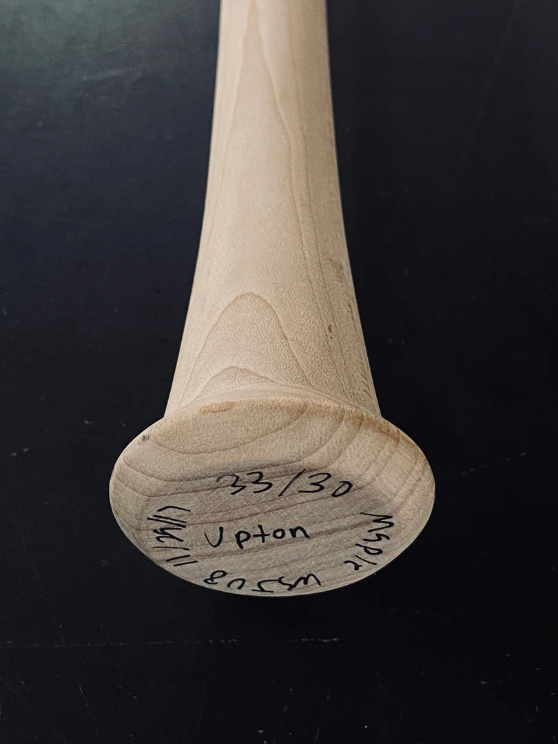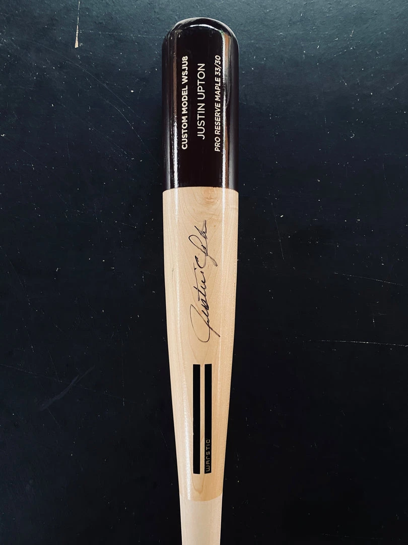 Bats created for Justin Upton for the Warstic Short Film “The Art of Hitting”. Pro Reserve Maple 33/30 WSJU8. Natural Bat with glossed handle and black Wartip. Features black Warstic logo and white engraving. Autographed.
