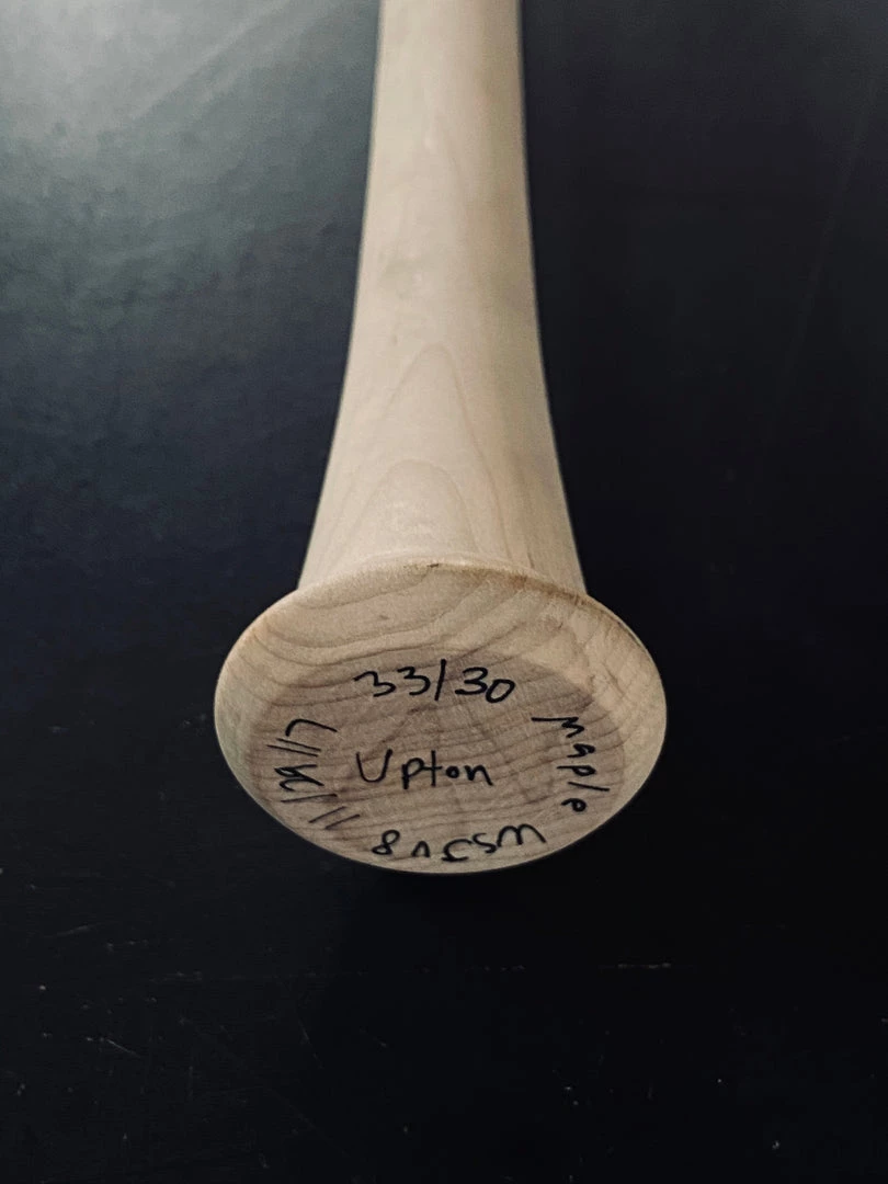 Bats created for Justin Upton for the Warstic Short Film “The Art of Hitting”. Pro Reserve Maple 33/30 WSJU8. Natural Bat with glossed handle and yellow Wartip. Features black Warstic logo and white engraving. Autographed.