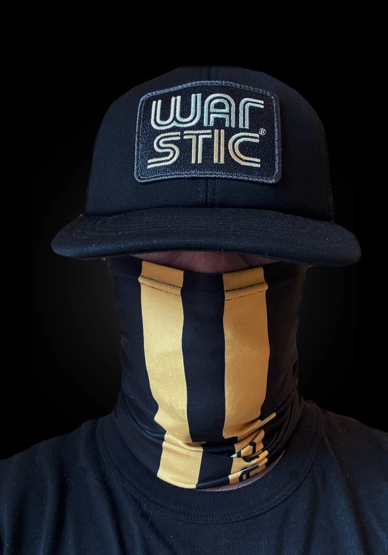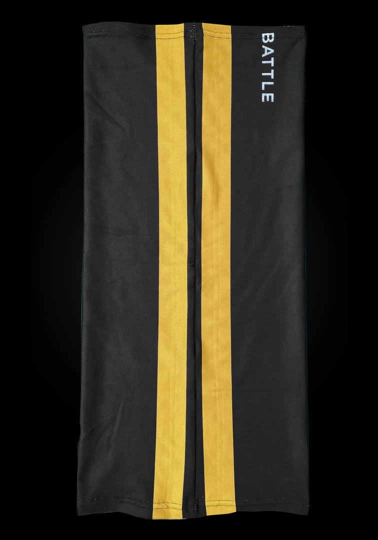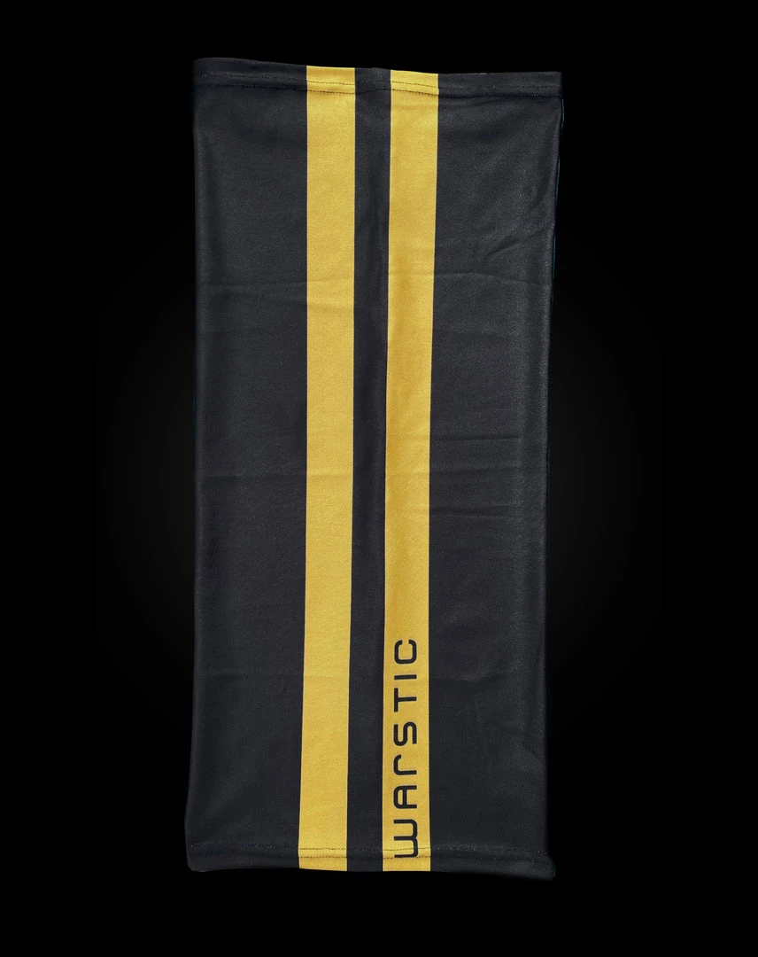 The Warstripe Neck Gaiter provides convenient face coverage with a light-weight, moisture wicking fabric. Black with gold Warstripe log on front and back, with “Warstic in black inside the Warstripes on the front and on back/seam side, “BATTLE” in white next to Warstripes near edge. One size only, will fit most adults.