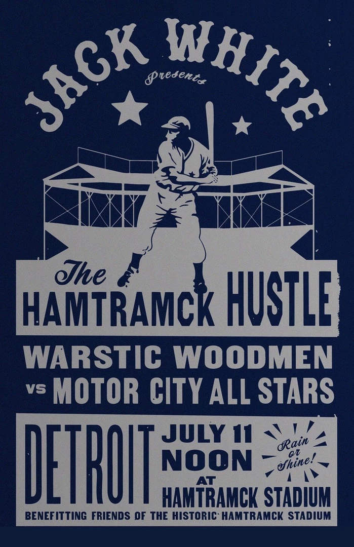 This special edition screen print commemorates the 2019 Sandlot game of The Warstic Woodmen vs Motor City All-Stars at Historic Hamtramck Stadium. Poster is 13″x19″ and features a navy background with a light, silver-gray print.