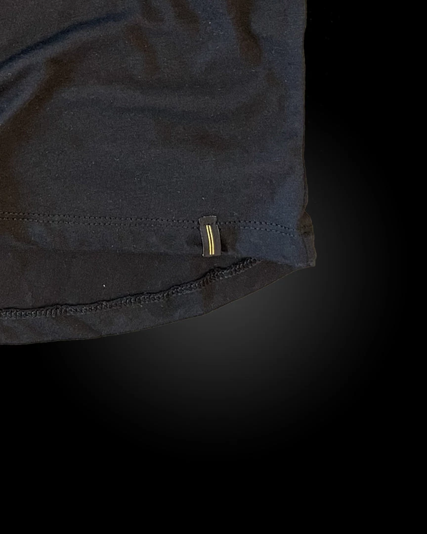 - Warstripe label on left front hem
