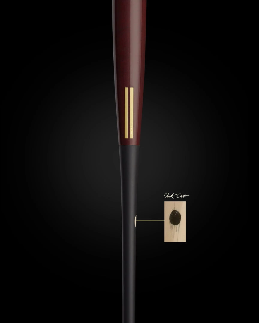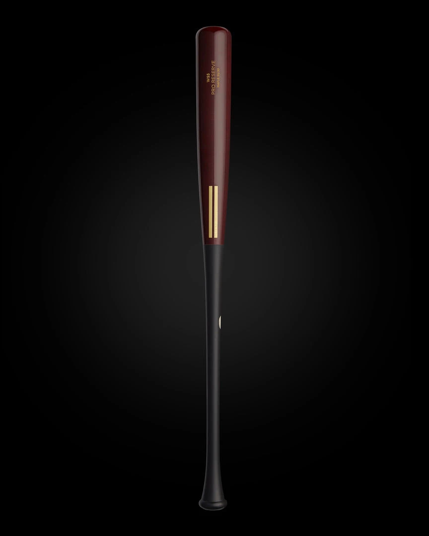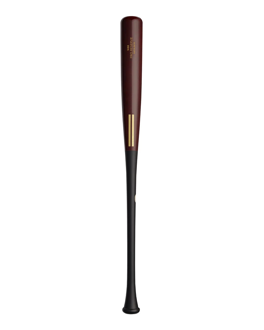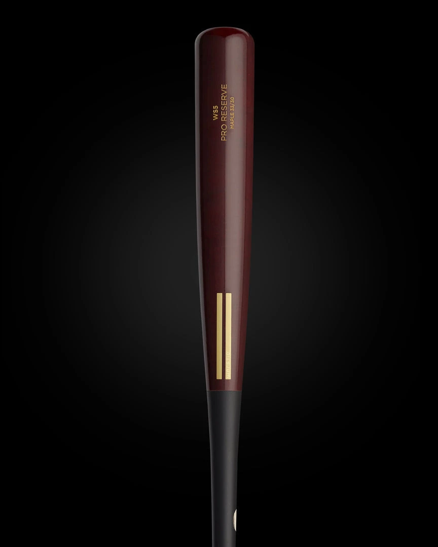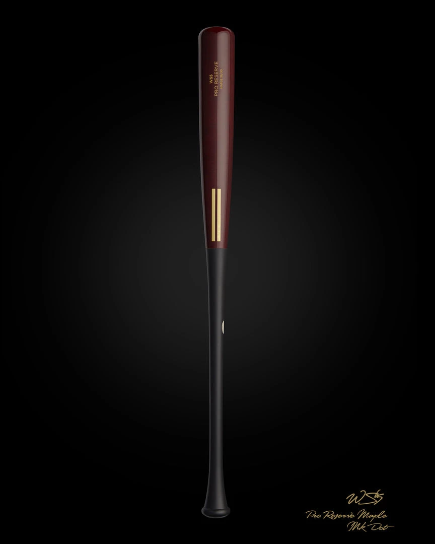 The WS5 Pro Reserve Maple Bat has a tapered knob and balanced feel; approximately -3 drop weight. The WS5 Maple has a wine half dip stain, black handle and gold engraving. Cut from our pro reserve stock of maple, all ink dot quality. No custom engraving or customization available on this model.