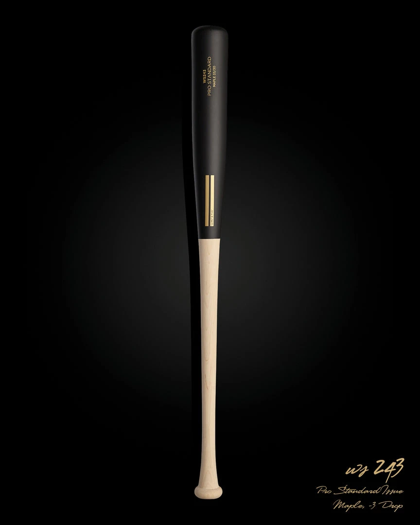 The Pro Standard Issue WS243 Maple Wood Bat has an extra large barrel and end-loaded feel; approximately -3 drop weight. The WS243 Maple has a matte black half dip barrel with a raw handle, and gold engraving. Cut from our top 10% reserve stock of maple. No custom engraving or customization available on this model.
