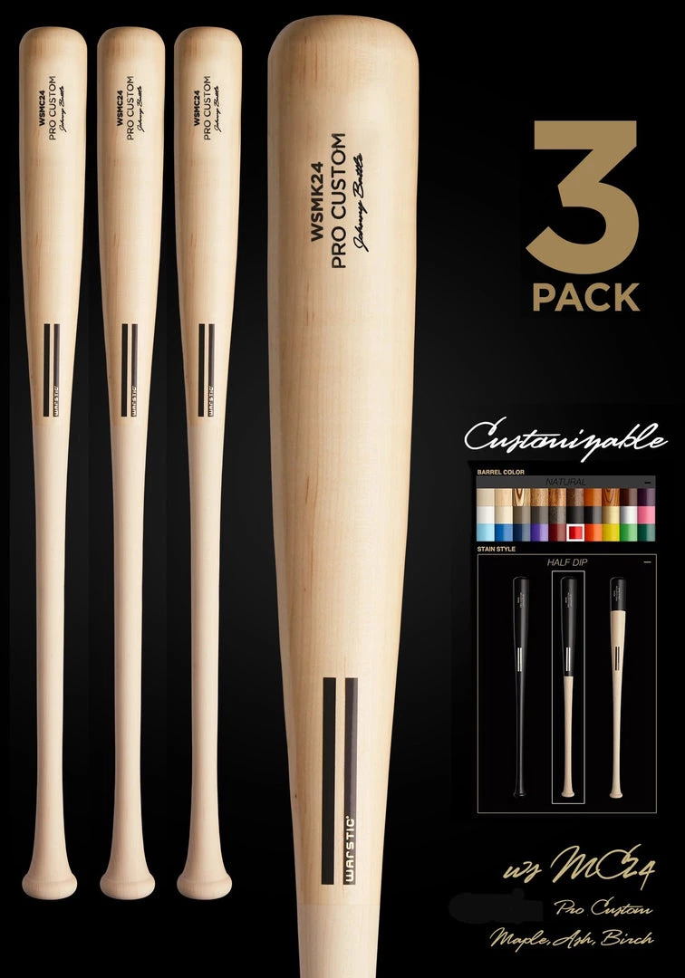 A great way to save when you buy 3 at a time. Not to mention… all wood bats will eventually break, it’s just part of the game. Most serious players prefer to keep set of at least 2 or 3 wood bats on hand- a bat for BP, a game bat, and a backup bat. All three bats in the set will be the same design, each bat in the set to cannot be individually customized.
