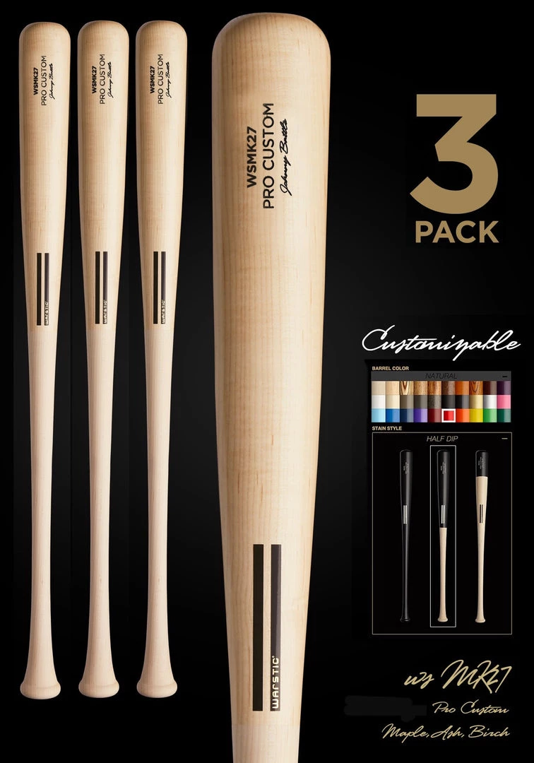 A great way to save when you buy 3 at a time. Not to mention… all wood bats will eventually break, it’s just part of the game. Most serious players prefer to keep set of at least 2 or 3 wood bats on hand- a bat for BP, a game bat, and a backup bat. All three bats in the set will be the same design, each bat in the set to cannot be individually customized.