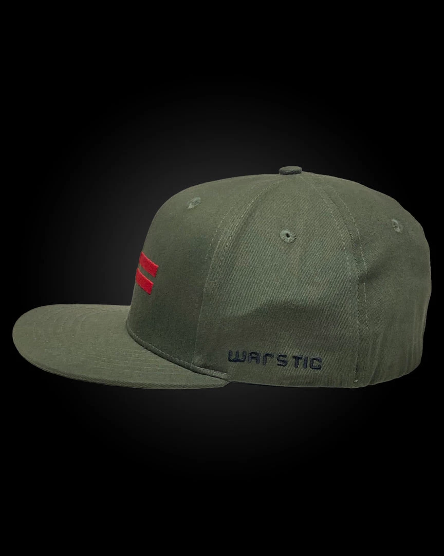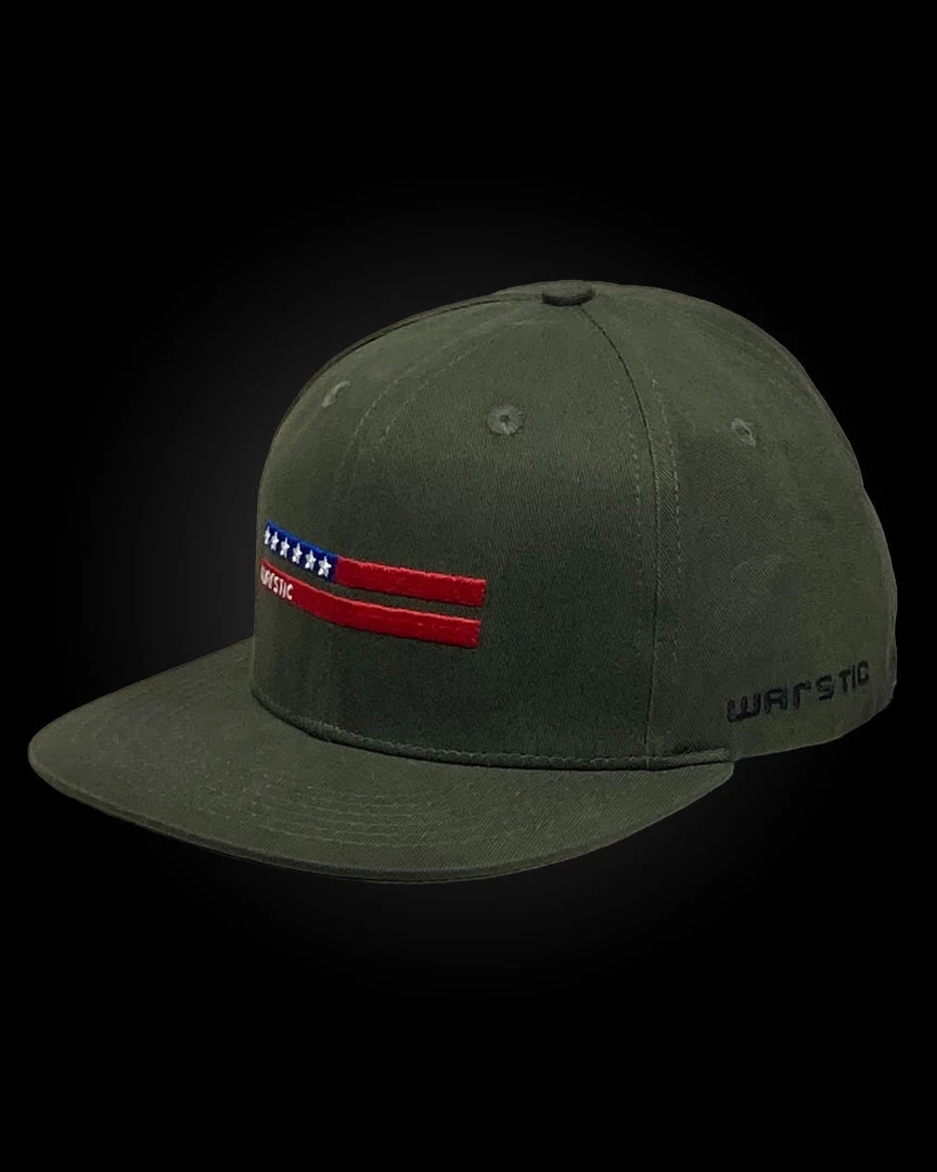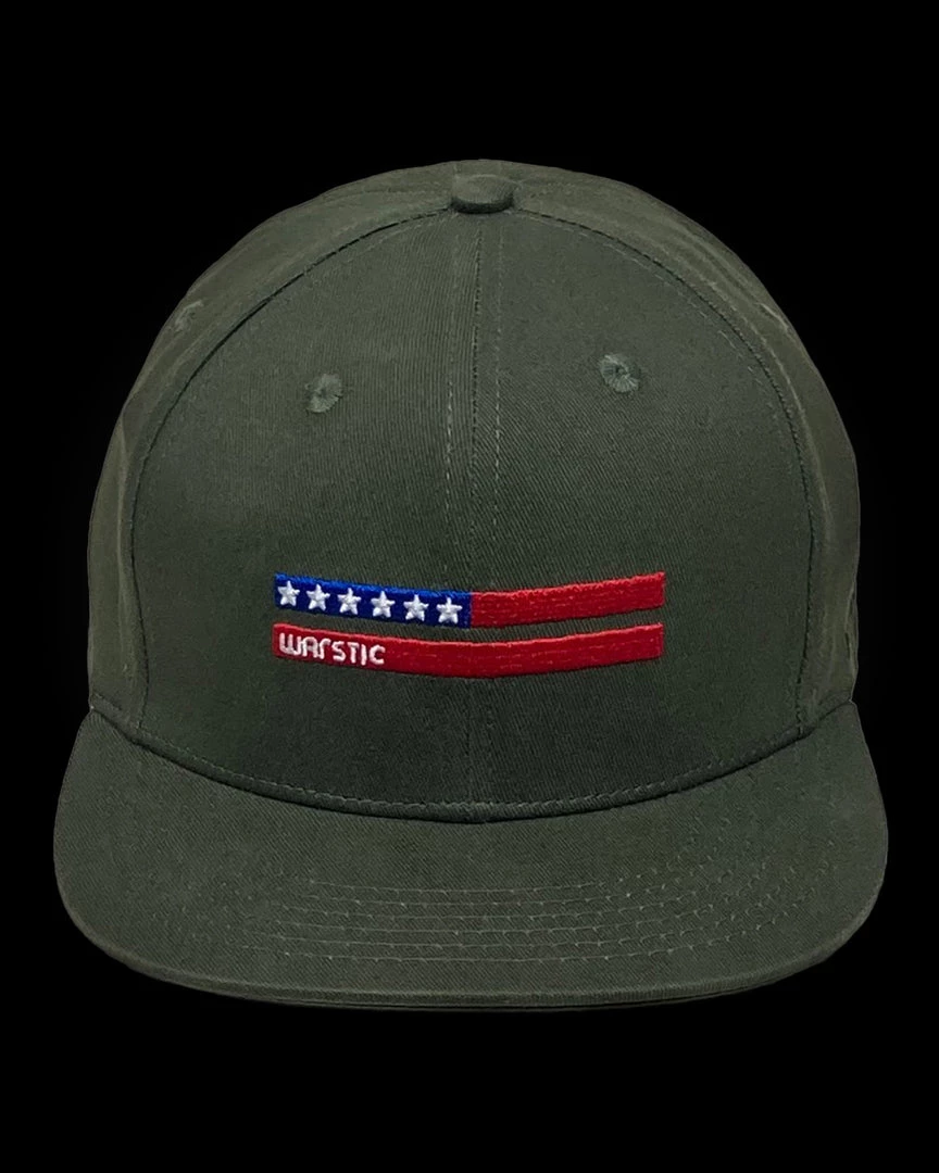 The Warstripe Fitted Stretch – Army Green/USA features raised embroidered Warstripes in Red, White and Blue to resemble the US Flag. Warstic embroidered in black on side of hat. Stretch fit, six-panel design; polyester/spandex blend.
